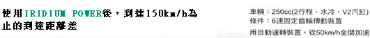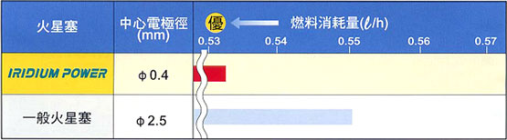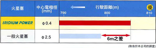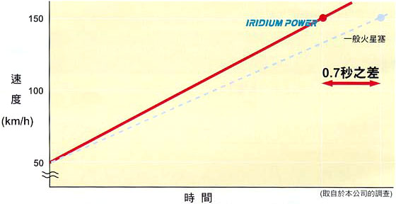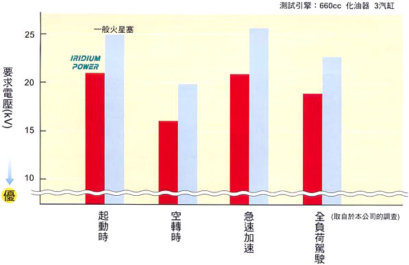 銥合金性能型與一般火星塞相較之下,成功降低了3~5KV的跳火電壓。