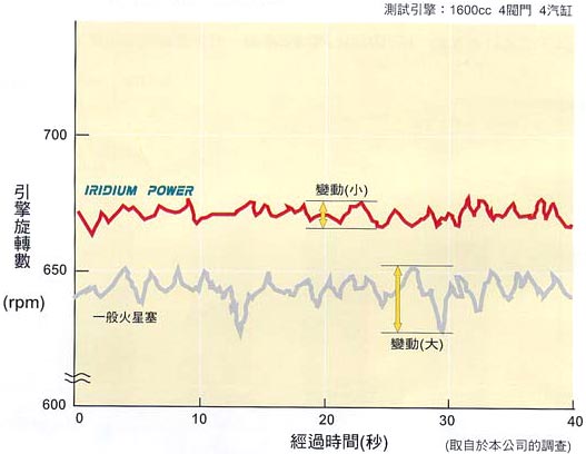 與一般火星塞的大旋轉變動情況相較之下,銥合金性能型能維持滑順的怠速旋轉。