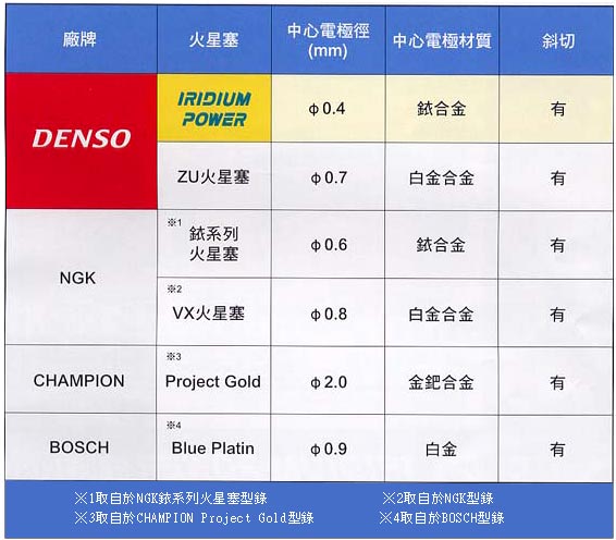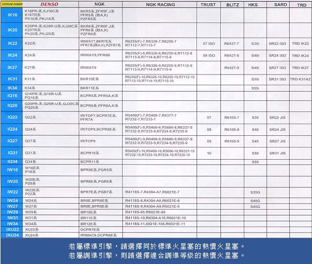 銥合金性能型大多數可用來替換安裝於國產車、進口車的標準火星塞。請利用下表參照檢查您目前所使用的火星塞型號與其可相容性,從中選擇銥合金性能型。倘若此表內沒有記載您所使用的火星塞型號,請利用車輛別適用表,選擇適合府上汽車的銥合金性能型。