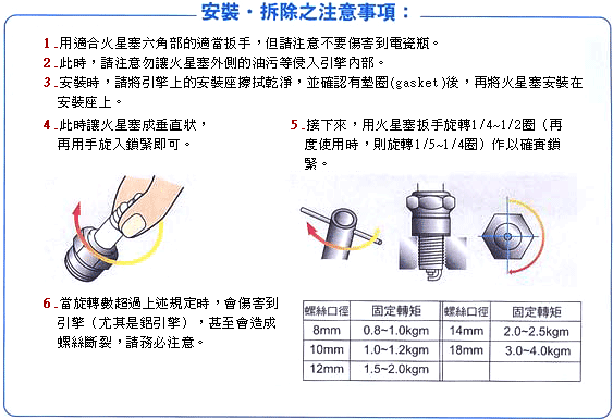 同於一般火星塞一樣,請按照正確程序用適當的轉矩進行安裝