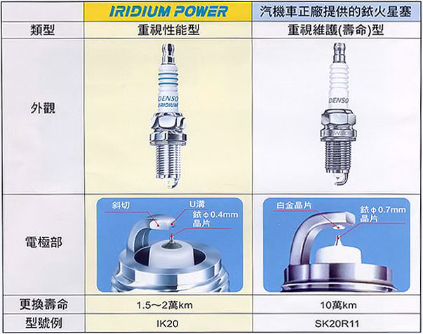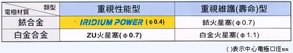 銥合金性能型 屬於重視性能型的火星塞,而汽機車正廠提供的銥火星塞,則屬於重視維護(壽命)型的火星塞。雖然兩者都將新銥合金用於中心電極上,但因目的不同,因此電極口徑、接地電極規格也不同。
