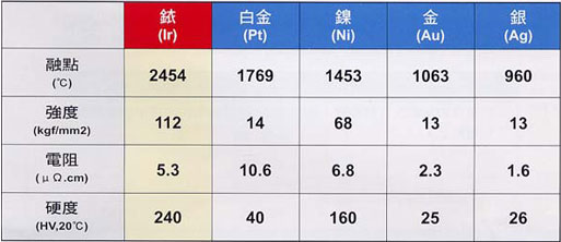 比起鎳、白金等金屬,銥擁有高融點且不易熔化的特性。雖然會因放電而增強消耗量,但在高溫狀態下會出現若干的氧化現象,因此純銥材無法使用於火星塞電極之用。